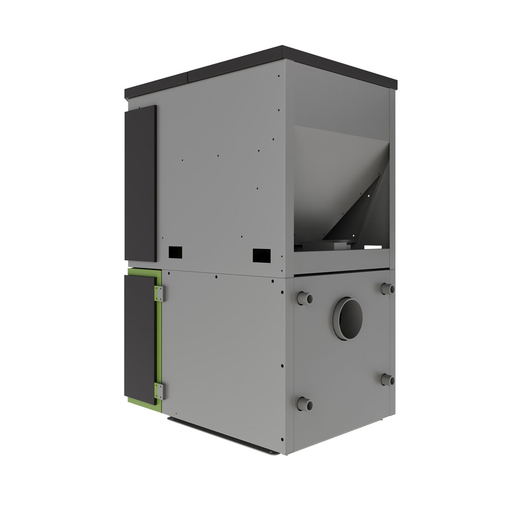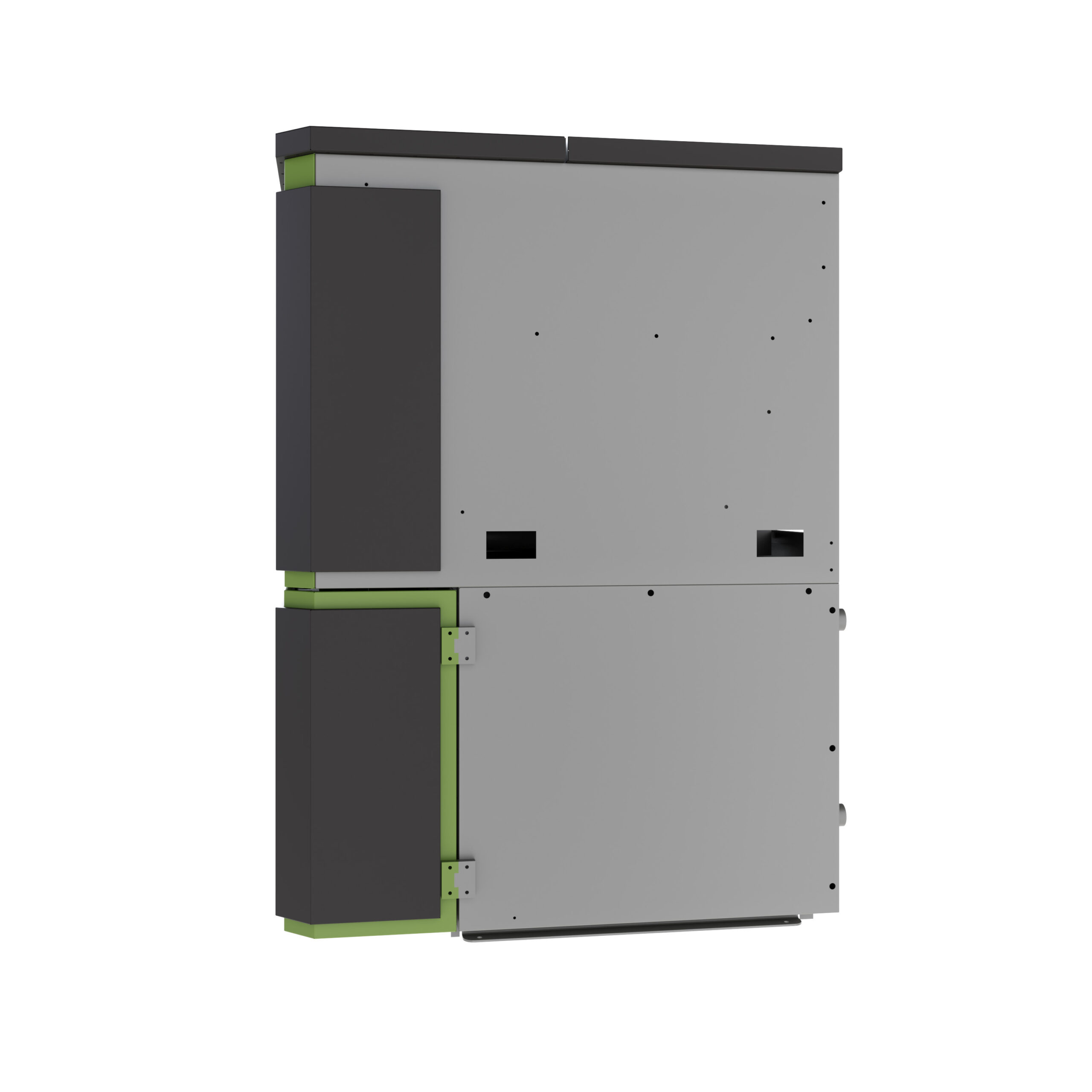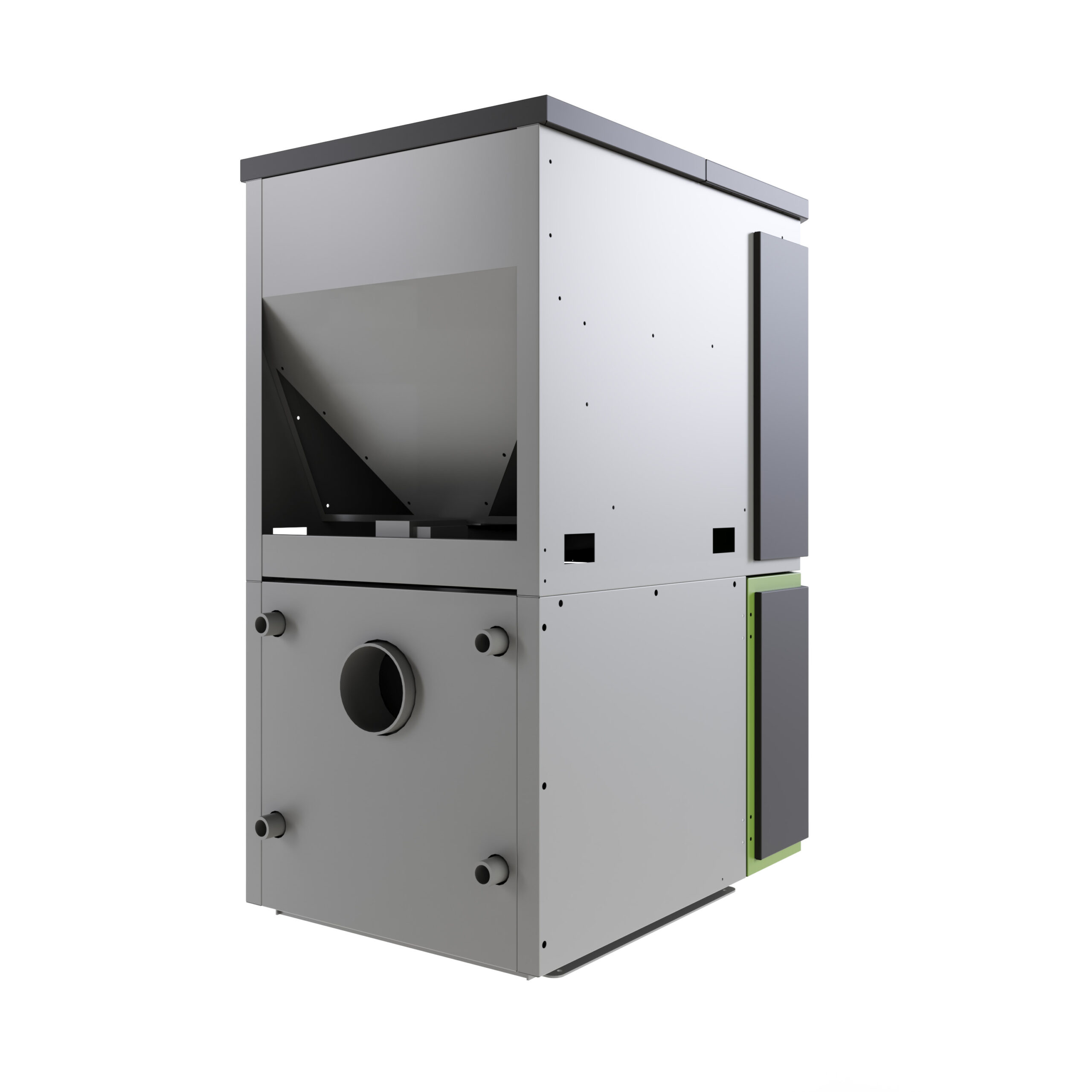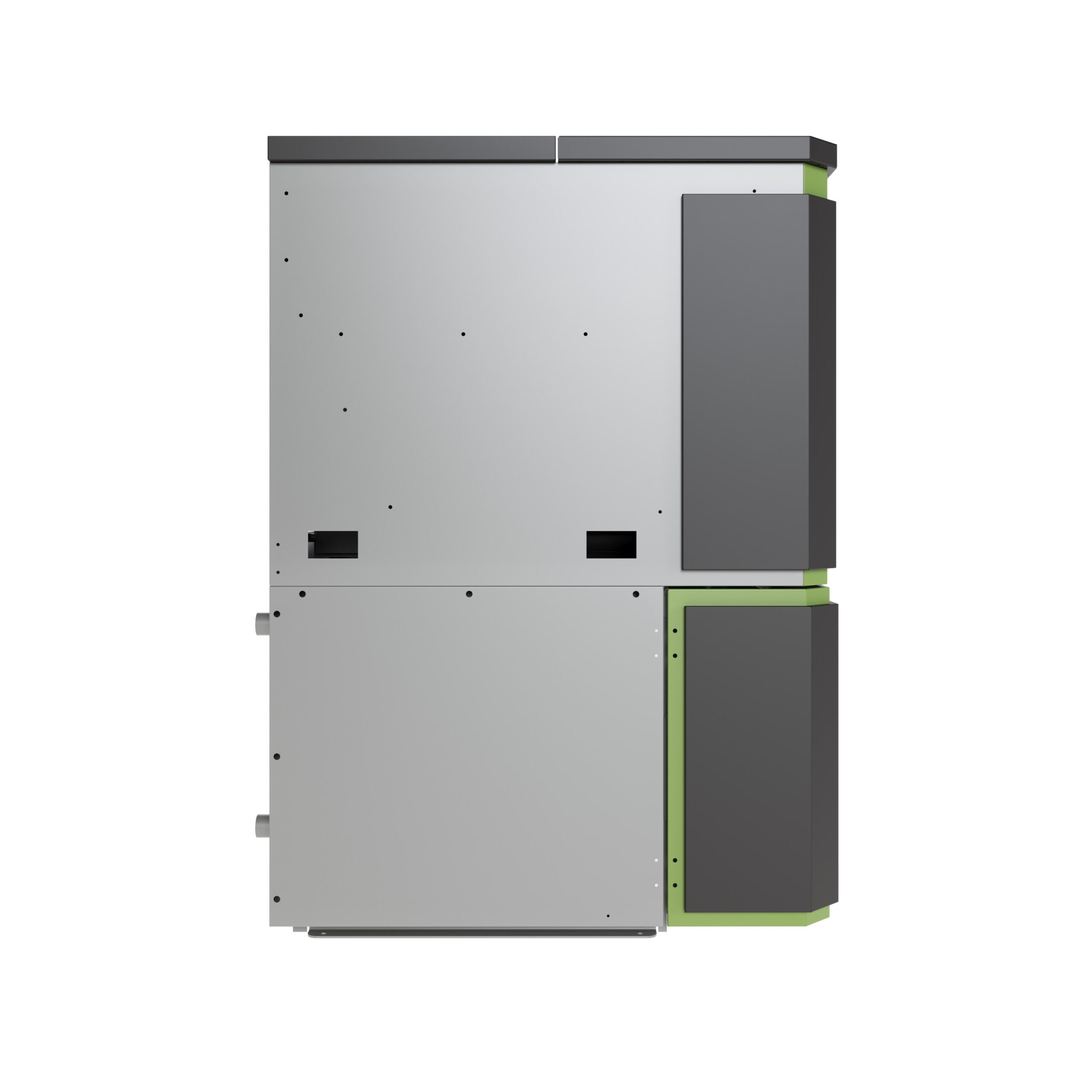 - Zwarta konstrukcja z zasobnikiem pelletu umieszczonym nad wymiennikiem daje oszczędność miejsca