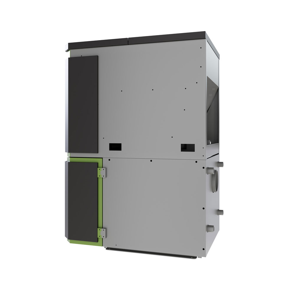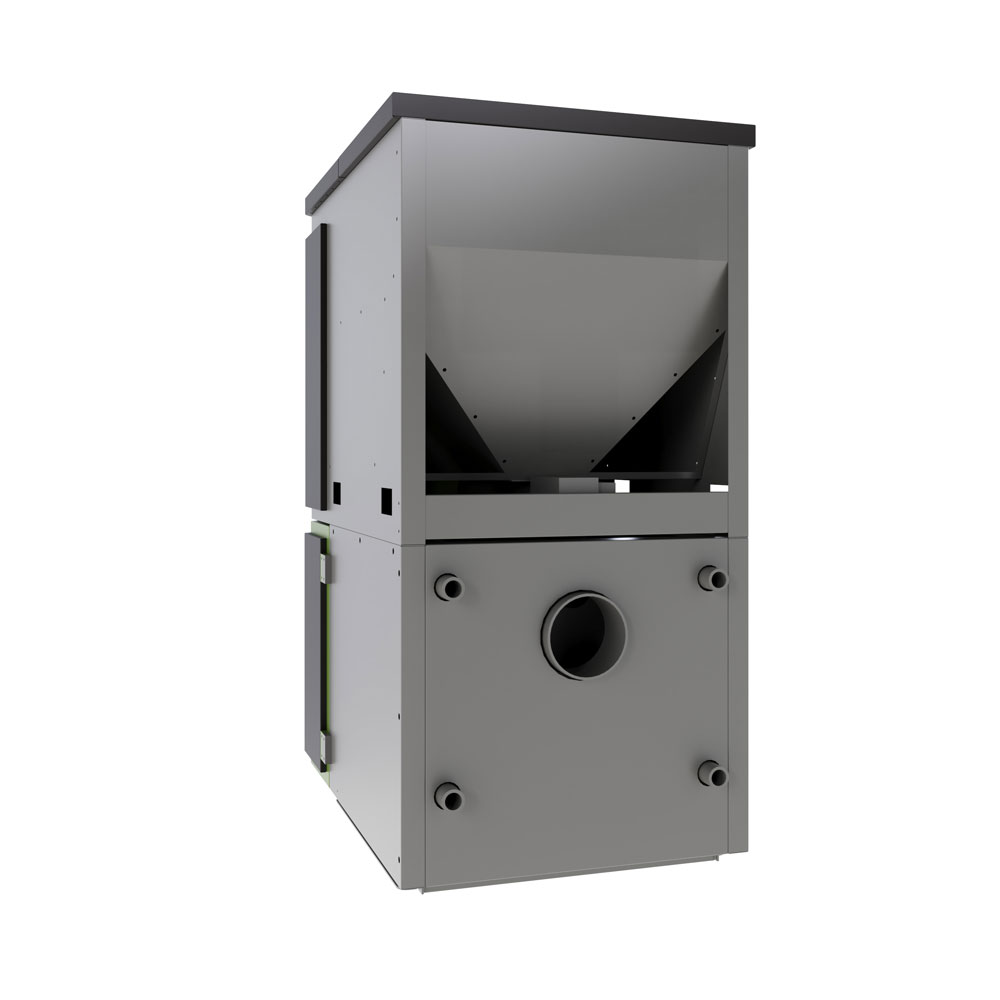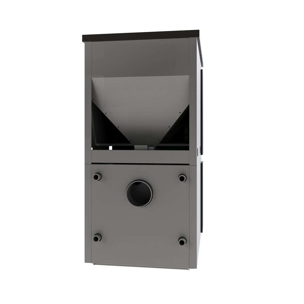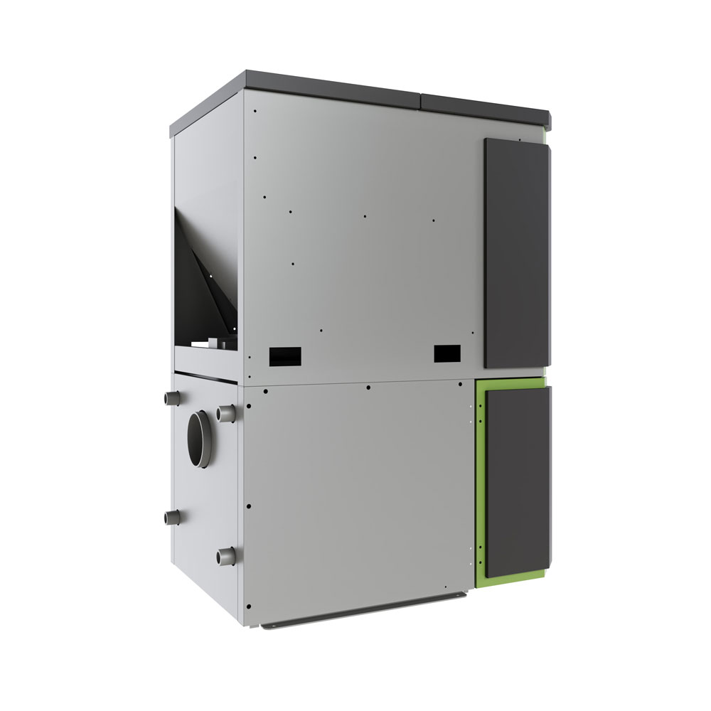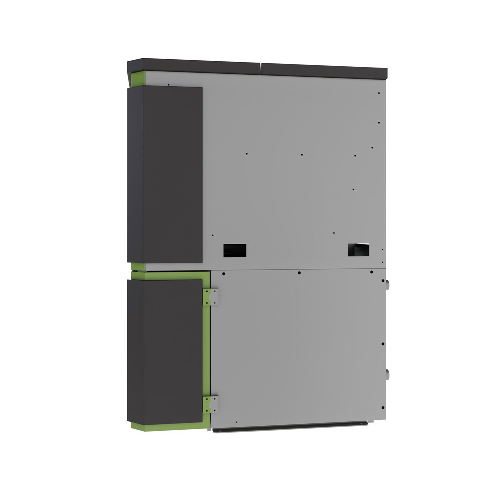 - Zwarta konstrukcja z zasobnikiem pelletu umieszczonym nad wymiennikiem daje oszczędność miejsca